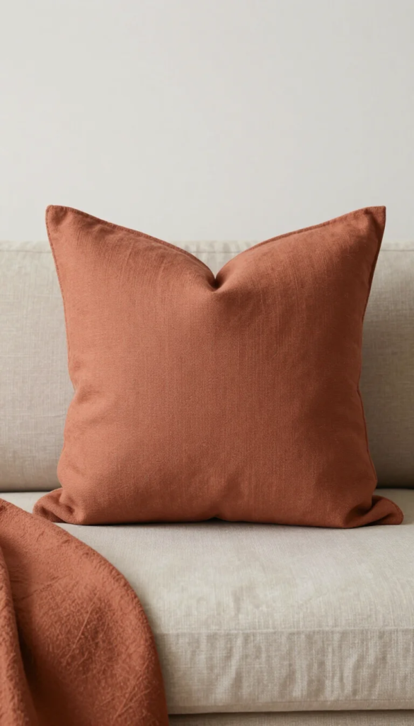 Dusty clay — a muted, desaturated terracotta — is the warm accent color the Japandi palette uses sparingly and deliberately. Where Afro Bohemian uses full-saturation terracotta freely, Japandi uses the same color family at half the volume: quieter, drier, more restrained. One dusty clay pillow warms the whole arrangement without asserting itself.