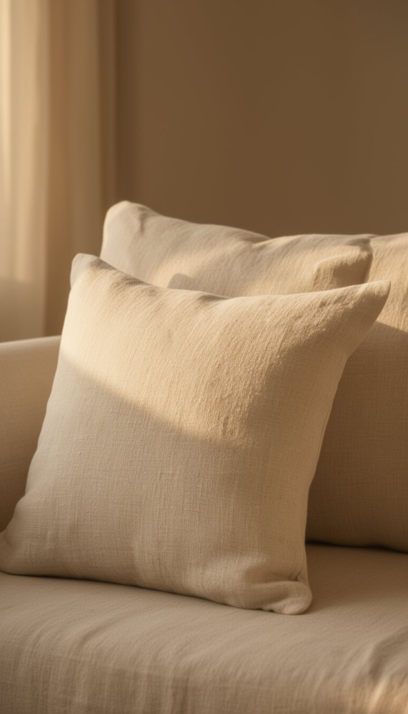 Undyed natural linen is the most honest Japandi pillow material — the color comes entirely from the plant fiber rather than any dye process, which gives it an organic variation that synthetic neutrals can’t replicate. The slight slub texture of the weave adds visual interest without adding pattern. In Austin’s warm afternoon light it picks up a warm straw tone that feels genuinely alive.