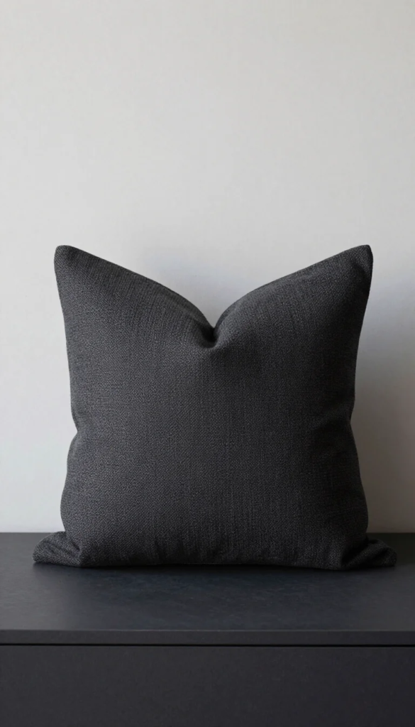 Every Japandi room needs one darker anchor to prevent the palette from reading as entirely washed-out. A soft charcoal pillow in a textured weave — not jet black, not true grey, the warm dark tone that sits between the two — provides that grounding without the starkness of black. The texture keeps it from reading as corporate.