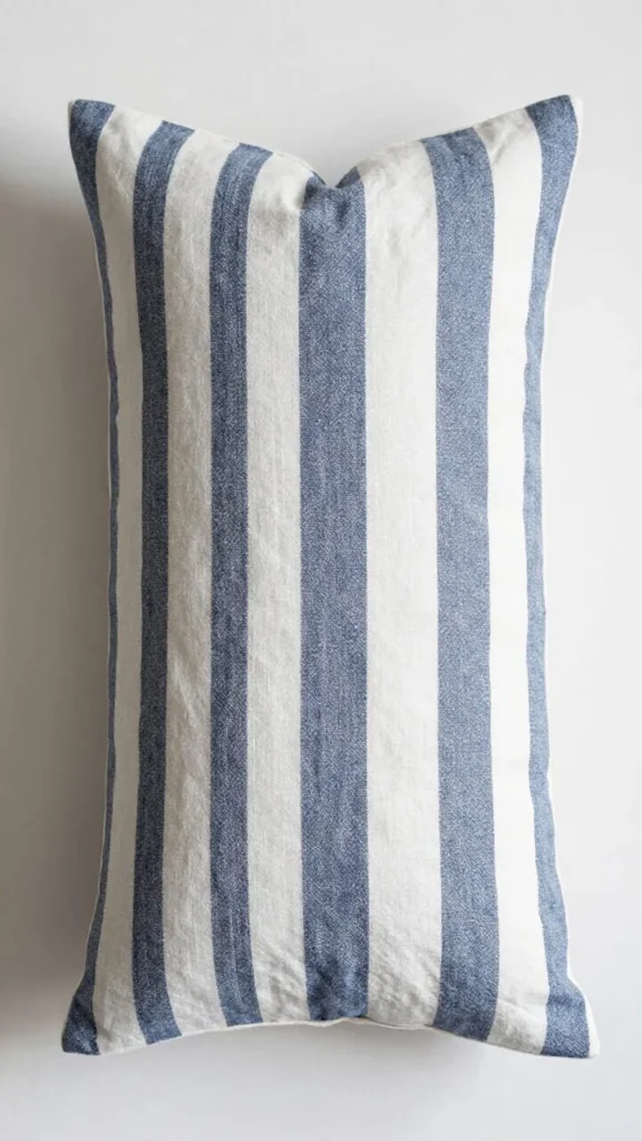 If your Scandi room is sitting entirely in whites and creams and needs one measured note of color, a classic thin-striped linen pillow in navy or dusty blue is the most historically accurate way to do it. The stripe scale matters — narrow stripes read as refined, wide stripes read as coastal. Narrow for Scandinavian rooms.