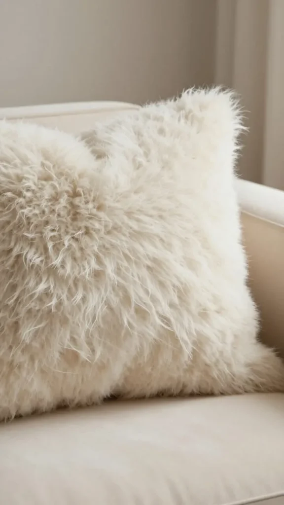 Color note: The ivory pile of faux sheepskin reflects warm light back into the room — in Austin’s afternoon sun it glows amber-adjacent, which shifts the whole sofa arrangement toward warmth in a way that no flat white fabric achieves.